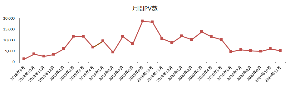 2020年11月の月間PV数は5,137PVと、2020年6月から5,000PV前後をウロウロしています。